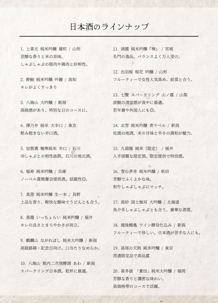 - 料理に合う約20銘柄の日本酒も飲み放題。超早割の2名様リターンならお一人1万円ポッキリ