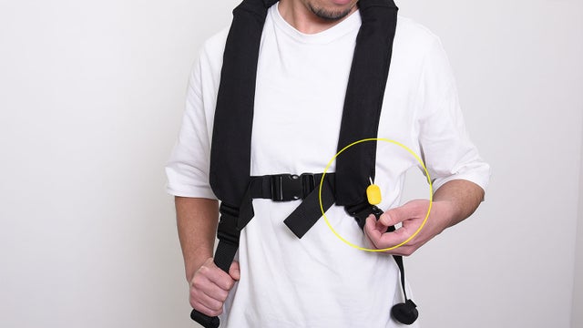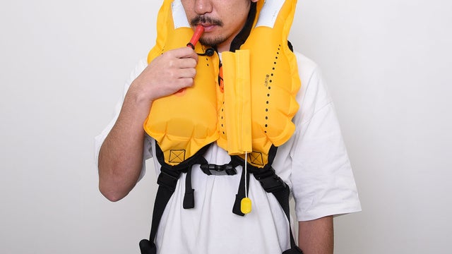 手動用作動索を引き、膨張させることでライフジャケットが開きます。