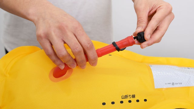 ライフジャケットに空気を追加したい場合は、右側にある補助送気管(赤い筒)で空気を吹き込みます。使用後はキャップを閉じてください。