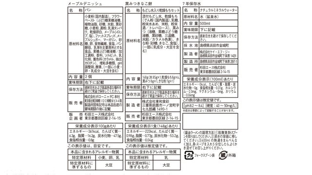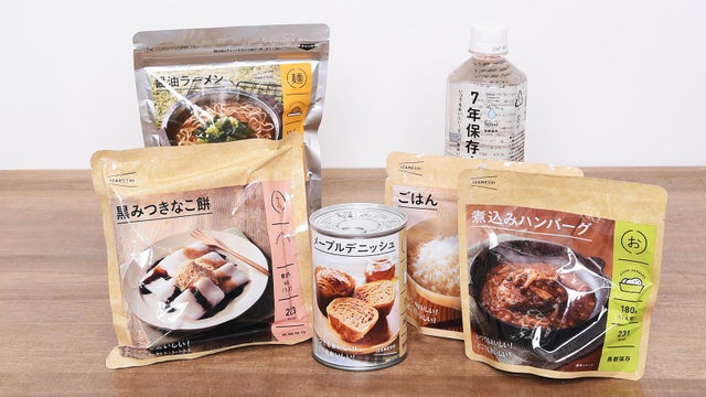 【セット内容】 ①ごはん×1 ②煮込みハンバーグ×1 ③醤油ラーメン×1 ④メープルデニッシュ×1 ⑤黒みつきなこ餅×1 *賞味期限: 3年 (製造日より) ⑥7年保存水500ml ×1 付属品: スプーン×1本 *保存食、水は製造から半年以内の商品をお届けします。 *各商品の原材料表記は下記の品質表示をご参照ください。