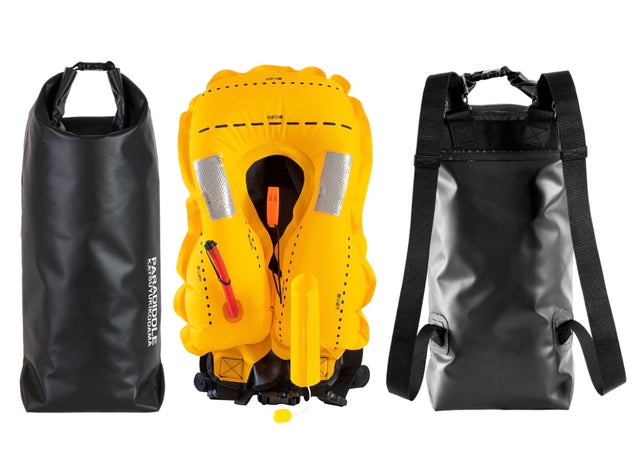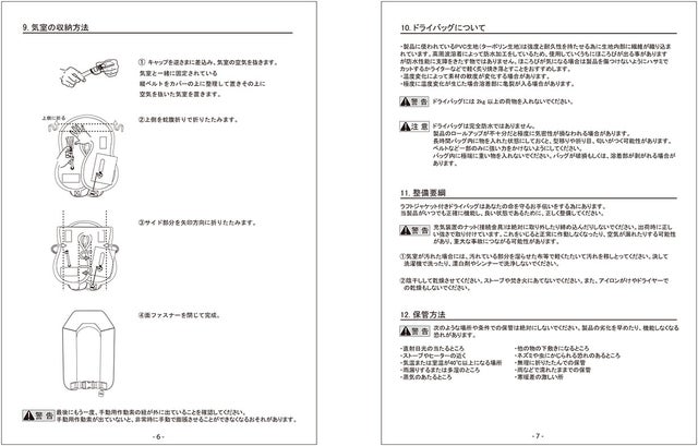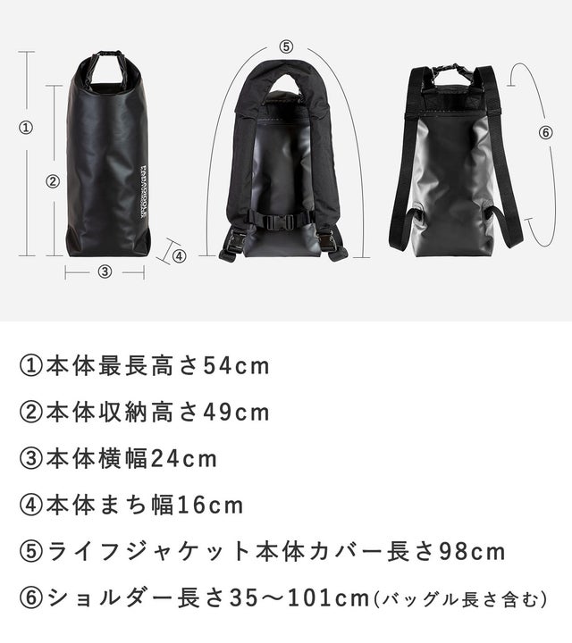 ・ドライバッグがある状態で水に浸かると、バッグの口元から徐々にある程度の水が入りますが、ライフジャケットを膨張することにより浮遊します。慌てずにご使用ください。