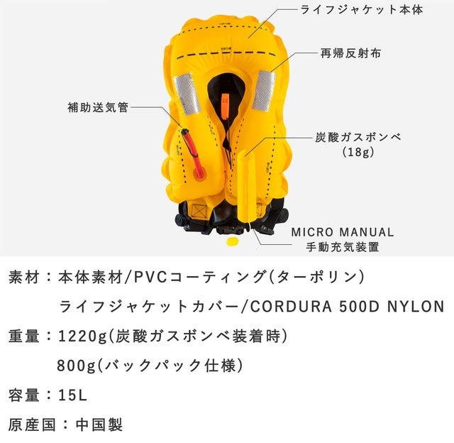 ※当製品は手動式で膨張します。救命胴衣を膨張させる際は、専用の炭酸ガスボンベ(18g)がセットされていることを必ず確認してください。