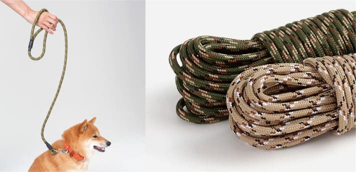 私たちは、ペットリードやハーネスの製造販売実績から丸編み紐の取り扱いにも精通しています。本革のチャームに合わせる部材として、代表的な丸紐のパラコードの3ミリ太さを採用し、ペットリードの雰囲気を継承することを意識しています。これにより、ナスカンやチェーン等の金具を一切使わず、全体的に軽量となり、使う用途を限定せずに扱いやすくなっています。また、カモフラージュ柄パラコードによりオシャレに仕上げています。