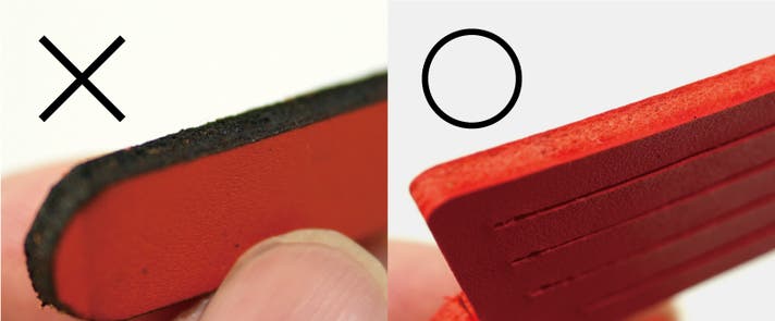 レーザーカットではレーザー照射による焼き付けでのカットなので、切り口が焼け焦げてしまい黒い焦げが付着してしまいます。厚みのある革をレーザーカットするとなるとかなりの高出力となり、精度不足や革表面への焼き付け不良等も発生してしまいますが、デジタルカットでは振動ナイフによる特殊なカッティングにより綺麗なカット面となり、本革の素材感を崩さずに仕上げることが可能です。