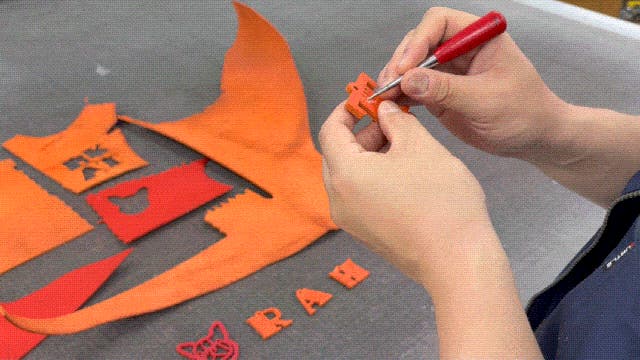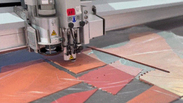 精密な設計により制作したカットラインを、本革の部位を見極めながら一カ所づつ位置を確定し本カット工程を実施しています。デジタルカットとはいえ、何度も試作を繰り返し、限界まで攻めた精密なカット設計を検討して参りました。