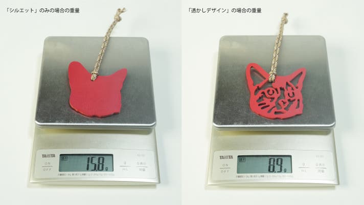 精密デジタルカットによる透かしデザインにより、どれほど軽量化が実現できているかと言うと、例えばCATシリーズのロシアンブルーの場合、シルエットのみをカットしたチャームでパラコードを含んで重量は約15.8gとなりますが、透かしデザインの場合の重量は約8.9gとなり、約43%軽量化を実現しています。また、NUMBERシリーズとALPHABETシリーズは、約15%~22%程度の軽量化となっています。(※自然素材の為個体差はございます)