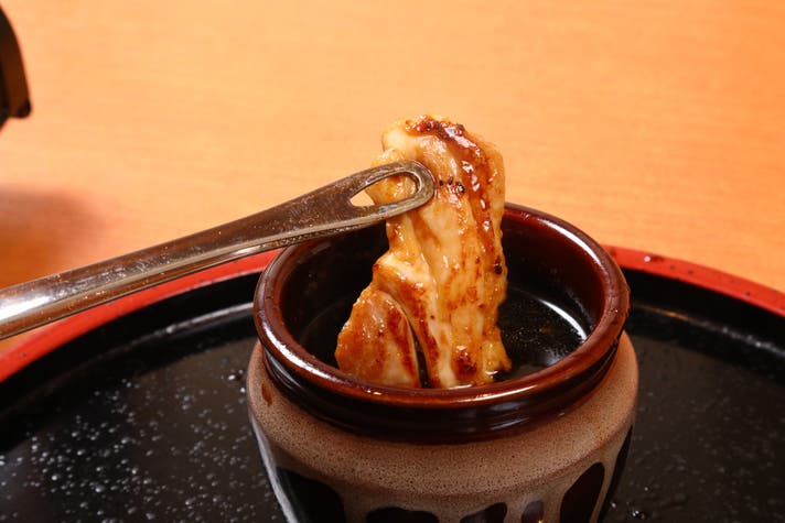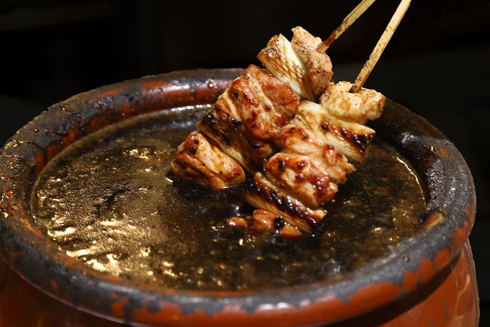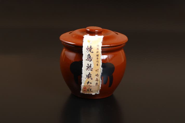 地鶏・銘柄鶏のガラと醤油、みりんなどを調合し寝かせておいたものを創業以来使い続けている壺に足しながら使用しています