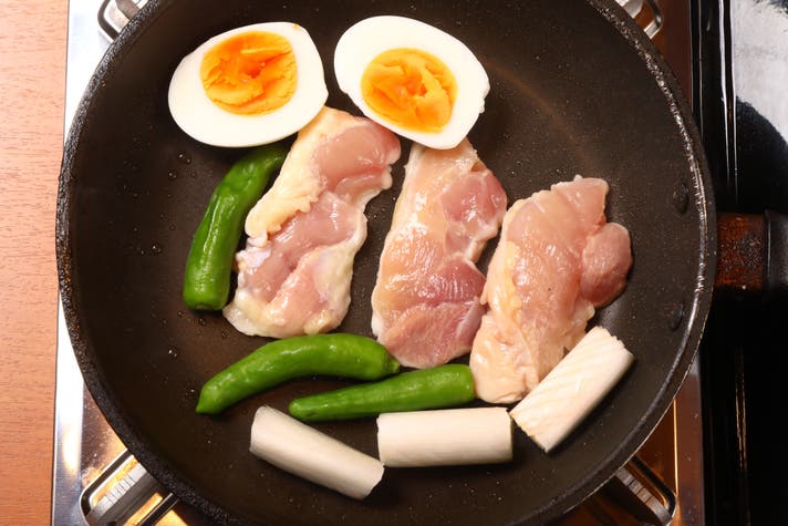 1 フライパンで信玄どりとお好みのお野菜などを30秒ずつ両面焼く