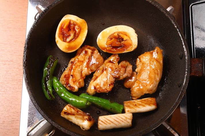 6 鶏肉によく火が通ったか確認して、すべての具材をたれに浸す