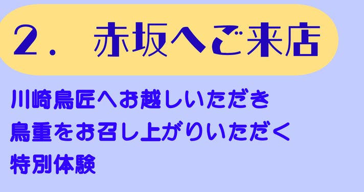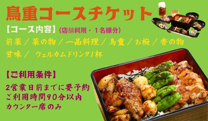 2 ご来店の上、川崎鳥匠の店舗にて鳥重をお召し上がりになられる料理コースチケットリターン