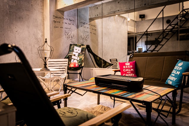 - この一軒ですべて完結。屋内ビーチでBBQができ、さらにカラオケ個室も完備。使い勝手抜群の空間。