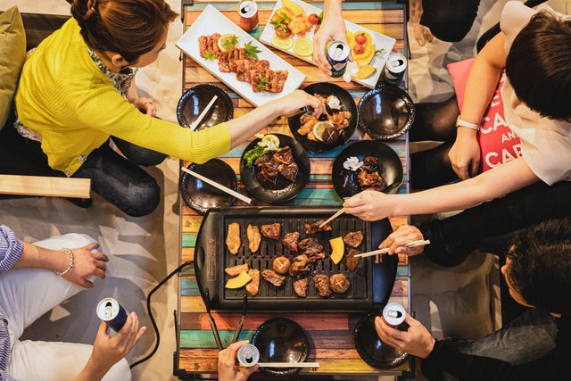 ビーチBBQのあとに特別個室へ流れたり、カウンターやテーブル個室で創作和食を楽しんだあと、個室ラウンジで二次会を開いたり……。