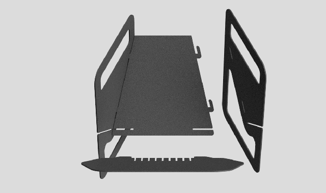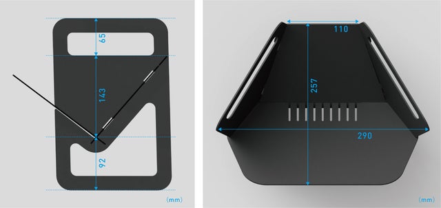 携帯と収納を考慮してのA4サイズ・4枚板・平面形状を基本要件に、設計部分でこれまでにない動的要素を取り入れ、構造による必要かつ可能な機能を追求した結果、今回の風の谷の焚火台が生まれました。アウトドアや焚火初心者の設計士が考えたこともあり、組立てや扱いが簡潔な仕様となっています。