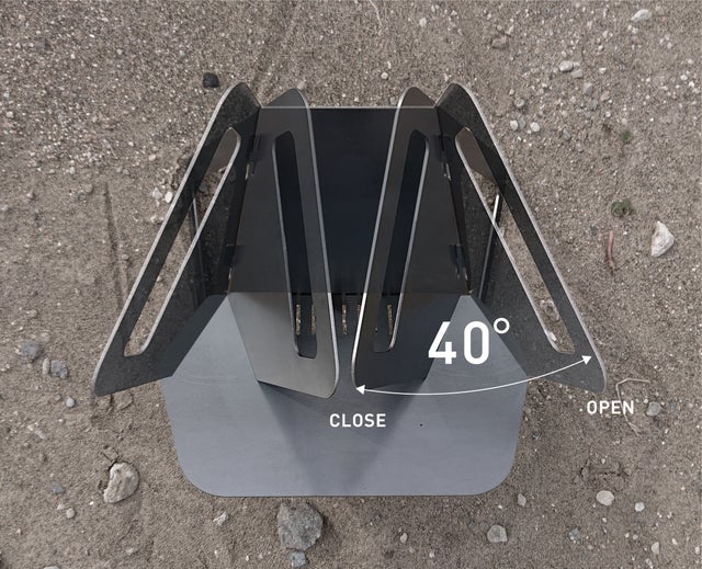 フラップはいつでも自由に開閉でき、片側最大40度の開閉調整が可能。これにより風を防ぐ方向、焚火の燃焼状態、薪炭の容量を調節することができます。