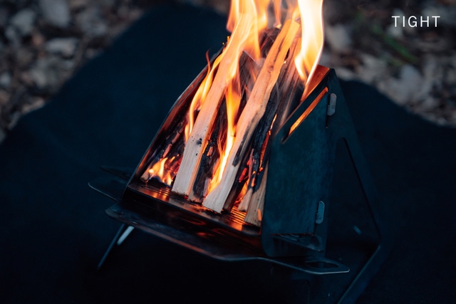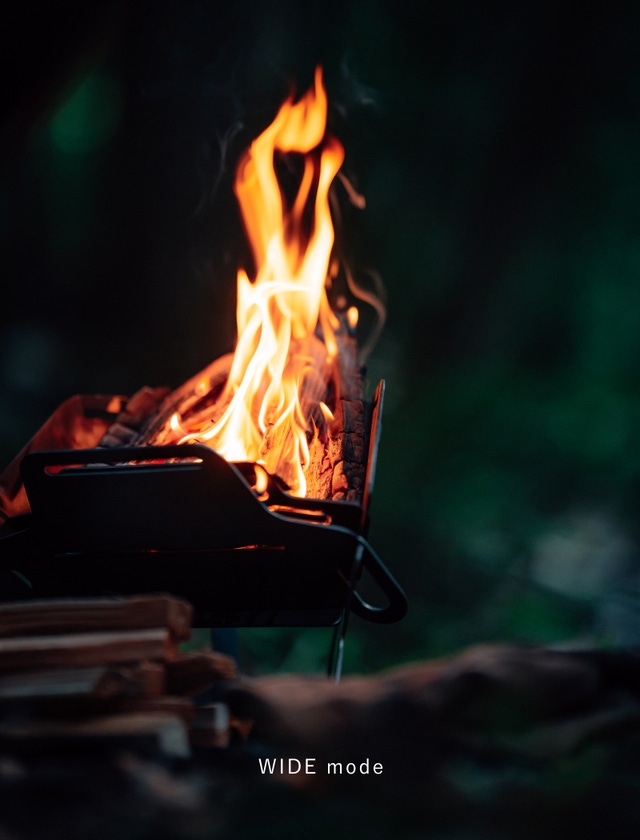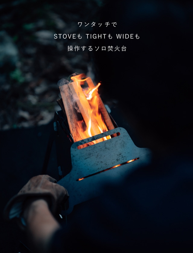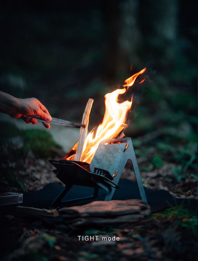 STOVE modeで火起こし器代わり、TIGHT modeで風防いらず、WIDE modeでリフレクター効果。荷物を少なく焚火をもっと気軽に。