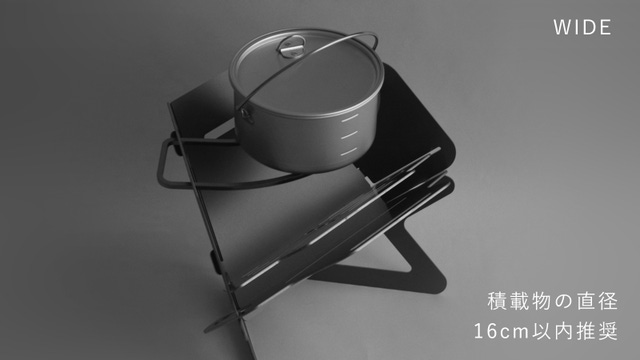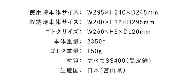 板厚による全体強度と各種可動に伴う安定性を考慮した本体重量は2350g+ゴトク150g。A4サイズですがオートキャンプ向きです。