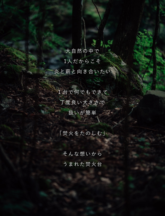 縄文時代の火床や陶器を焼成する窯などを参考に、アウトドアを新しい生活様式と捉え「炉」の検討を始めました。2022年夏の「風の谷の焚火台」から1年数カ月、燃焼について歩みを進めたソロ焚火台としてMakuakeに戻ってきました。
