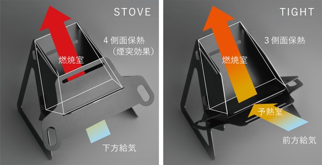 STOVE modeとTIGHT (WIDE) modeどれも燃焼に重要な「気流」と「熱利用」を重視した設計。STOVE形状は保熱高温化と直線的な空気の流れに作用、TIGHT (WIDE)形状は予熱給気で燃焼を安定的に補助。※燃焼は薪の質と量にも依存します。