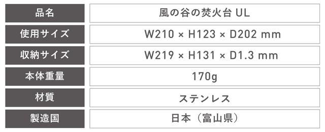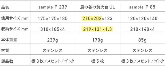 市販のサンプル製品の仕様との比較例です。風の谷の焚火台ULの「使用サイズの大きさ」と「収納サイズの小ささ」に特徴が見られます。風の谷の焚火台ULは板5枚のみで完結しており細かい付属品がないので紛失の心配も抑えられます。独自の開閉機構によるワイドオープンやマルチゴトクも含めて、あたらしい小型軽量焚火台といえる仕様になっています。