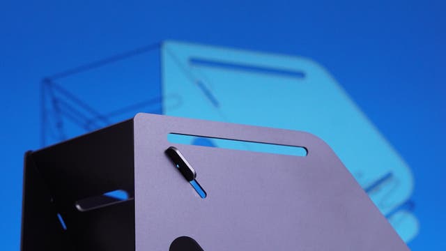 組み立ては4ステップ。フレームと側板の差し込み×2、背面ヒンジ差し込み、底板の差し込みで設置が完了です。薄板でもしっかりとした剛性へつながっています。