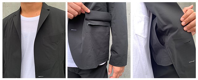 袖口部分の本切羽仕立てのボタンについても、デザイン上表からは見えない仕様となっており袖口もスッキリした印象となっています。また、デザイン性やコーディネートを活かして袖口をまくるシーンも想定している為、あえてボタンを隠した仕様にしています。