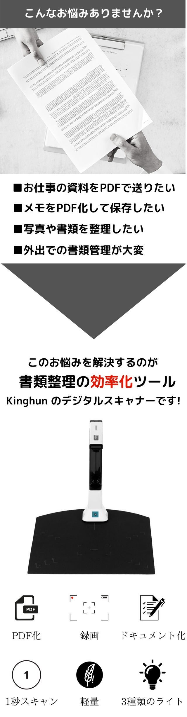 KC5M01モデルは個人で使用するスキャナーとして開発されており、軽量で持ち運びやすい仕様となっております。資料やメモをデジタル化するのは日本で需要があると思いKinghuと日本総代理店契約を結びご紹介をさせて頂くことになりました。
