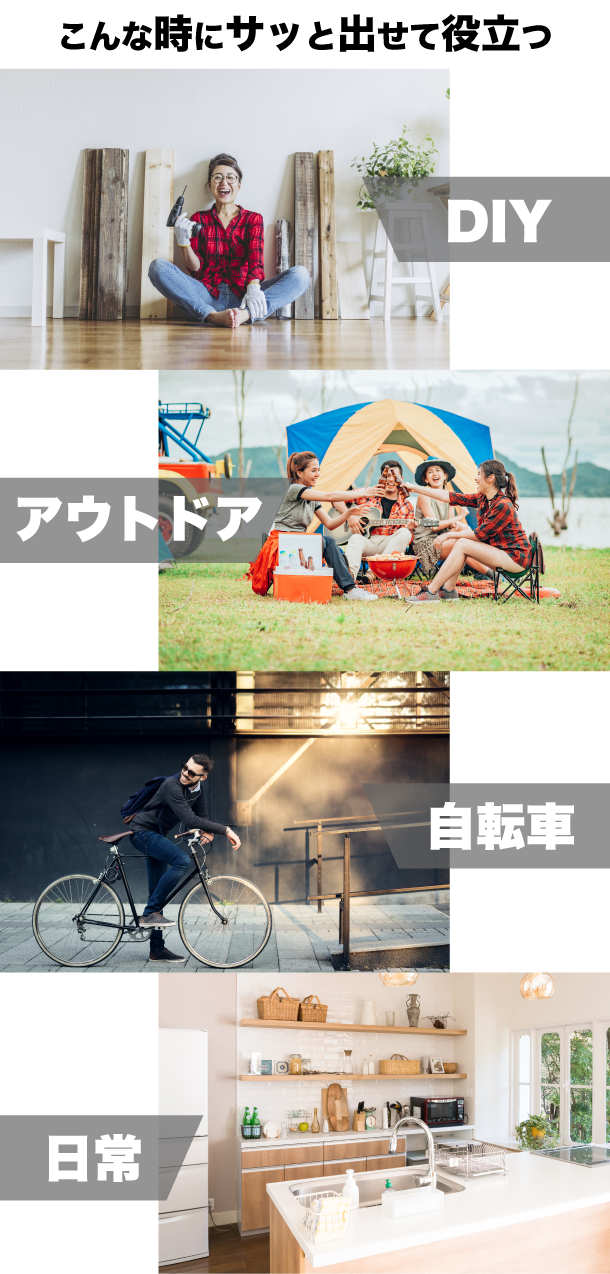 A:自転車乗りの方やアウトドアな方、仕事で工具を使われる方にぴったりです。
