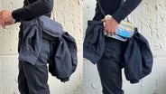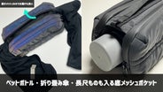 底面のファスナーを開くとメッシュ生地が現れ、濡れたペットボトルや、折り畳み傘をいれるのにも便利です。長尺ものも入るので、脱いだアウターを入れることもできます。