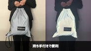 ナップサックは肩掛けや担ぐのはもちろん、持ち手がついているので、手提げバッグとしても使えます。またフックなどに引っ掛けるのにも便利です。