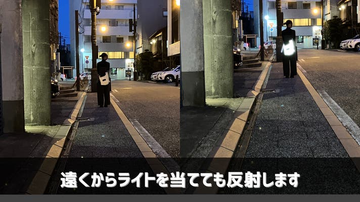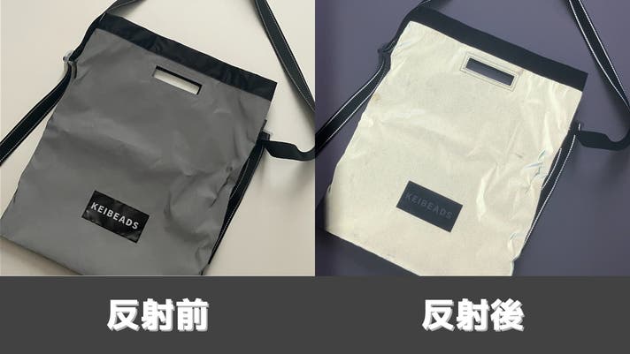 ※再帰性反射材(リフレクター)は、車のライトやカメラのフラッシュなどの光を浴びた際に、入った光が同じ角度で戻って反射して見えます。ただライトを当てるだけでは光って見えません。リフレクター自体が発光するものでもございませんので、ご注意ください