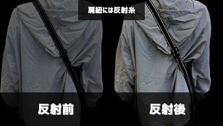 肩紐も反射材付きで前後光る
