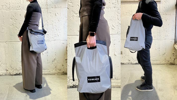 シルバー反射生地を前面に使い、反射時は白っぽく光る安全性です。普段使いから、フェス、アウトドア、買い物にも、使い方は自由自在です。
