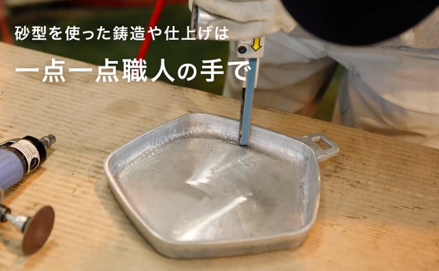 商品を数千個単位の大量生産ではなく、今回お届けするスキレットのようにオーダーメイドで少量生産する『手込め砂型鋳造』と呼ばれる手法を用い、一点ずつ手作りした砂の型に金属を流し込み、固まった後は型を壊して製品を取り出します。