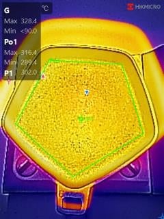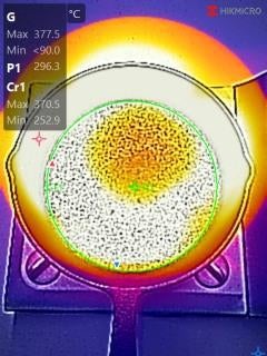 【鉄・アルミそれぞれのスキレット(浅型)について、加熱後178秒経過した時のサーモグラフィを比較】