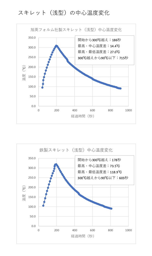 アルミ製スキレットの方がゆるやかに下降しており、高い蓄熱性があることがわかっています。
