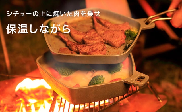 浅型のスキレットはフタとしても活用でき、蒸し料理やダッチオーブンとして使用することも。(注:炭火を使用する際は300℃以下で使用下さい)