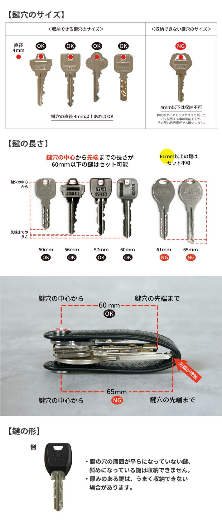 ・鍵穴の中心から先端までの長さが61mm以上の鍵は収納することができません。