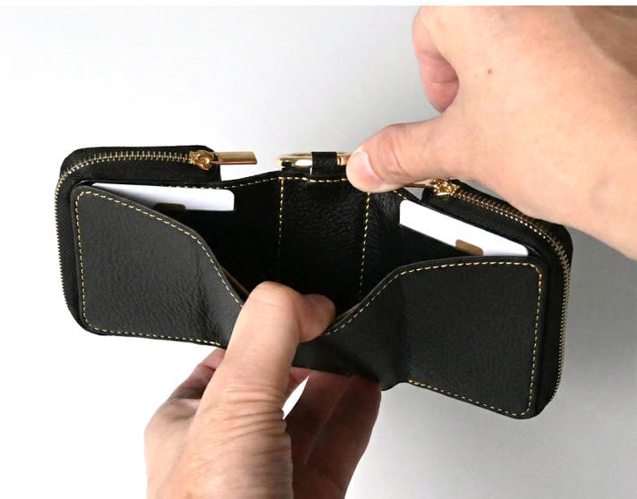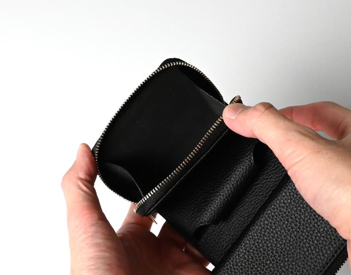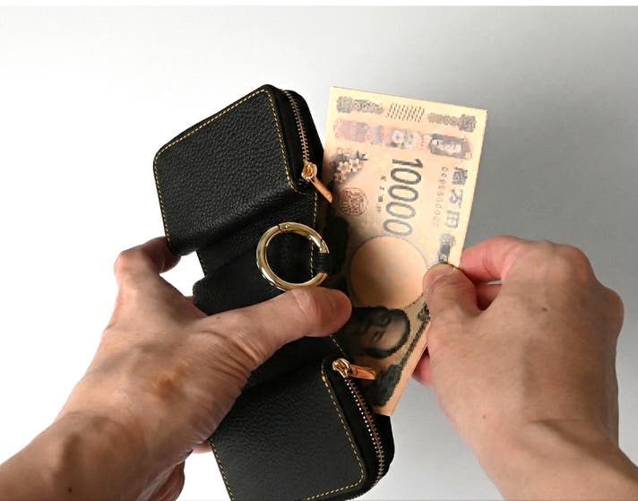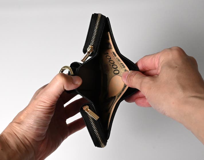 大きく開く構造で、お札を約20枚スッキリ収納。日常使いにちょうどいい容量です。