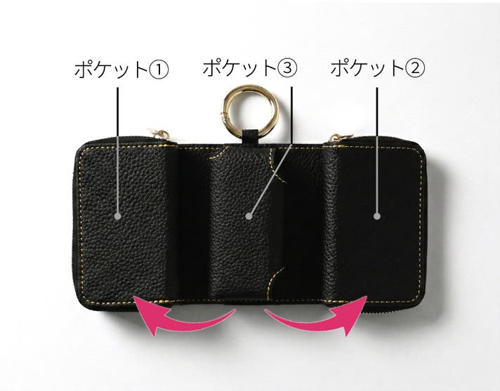 ポケット①・②・③の独立構造で、スマートキーを分けて収納。観音開きのように開く構造で、内蔵マグネットで固定されます。重ならず、かさばらず、快適に持ち歩ける構造が特徴的。それぞれポケット内の構造を見ていきましょう。