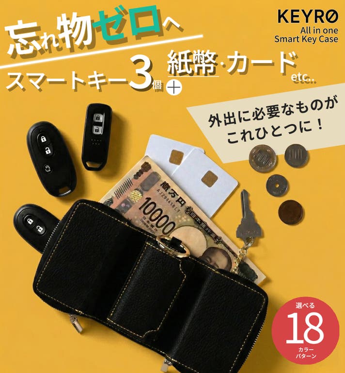 - スマートキー3個、カード4枚、紙幣を収納できるスマートキーケース。もう財布は不要な時代へ!
