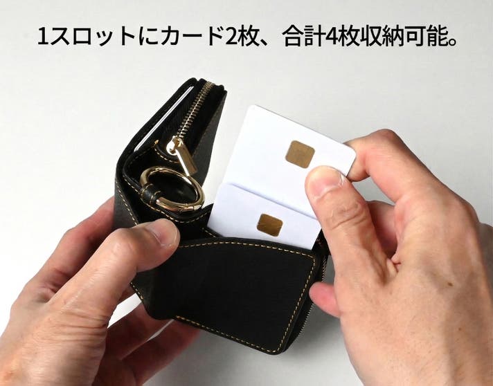 札入れの内側には、カード専用スロットを2か所設けています。1スロットにつき最大2枚、合計4枚のカードを収納可能です。免許証、マイナンバーカード、クレジットカードなど、日常で必要なカードをしっかり収納できます。