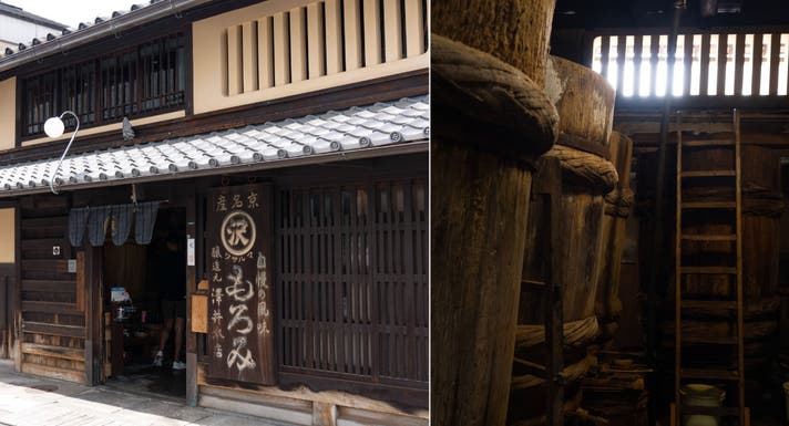 店内の奥には、今も現役で使われる大きな木桶や釜があります。この昔ながらの道具を使い、頑固に守りつづけた味を口伝で伝えています。