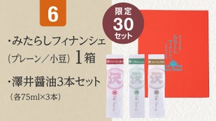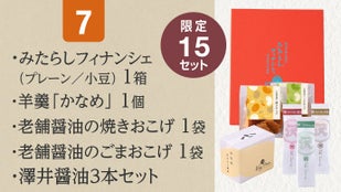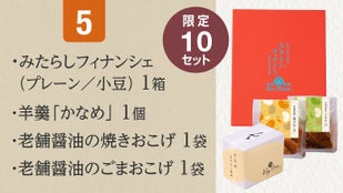 みたらしフィナンシェ、羊羹「かなめ」、焼きおこげ・ごまおこげ、醤油のセット