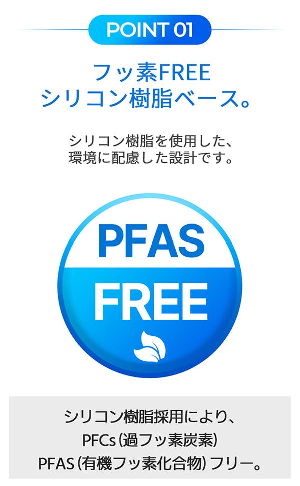 液化ガスを使用しないスプレー方式でGOOD ! 安全認証取得済み ! PFOA・PFOSなどの過フッ素化合物の心配は不要です。