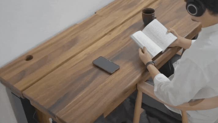 空間:黒のモーターパーツと組み合わせれば、そこはまるでホテルの書斎。深く、濃密で、時が静かに流れるような空間が現れます。一つとして同じものはない木目が、あなたのデスクに特別な表情を与えます。