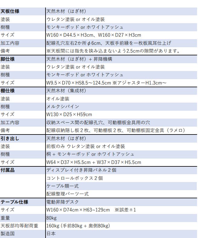 【安全に関する極めて重要なお願い】 本製品は、2枚の天板が独立して昇降する特殊な構造を採用しております。ご使用の際は、以下の点に十分ご注意いただき、安全にお使いくださいますようお願い申し上げます。 ■ 挟まれによる怪我の危険性について 天板の昇降中、「奥の天板と手前の天板の間」、「奥の天板と下の収納棚の間」、「天板下の収納棚と床の間」には、指や脚、物を挟み込むと大きな怪我や破損につながる大変危険な箇所があります。 操作中、およびその前後には、これらの危険箇所に絶対に手や足、指、顔などを入れないでください。「天板下の収納棚と床の間」の対策として、昇降範囲設定機能で脚が挟まらない下限高さを設定してください。 小さなお子様やペットが近くにいる状況での操作は絶対におやめください。操作は小さいお子様自身に絶対に行わせないでください。 障害物検知機能は、あくまで補助的な安全機能です。挟まれ方や柔らかいものによっては作動しない場合があります。この機能に頼ったご使用は大変危険ですのでおやめください。 ■ 免責事項 取扱説明書に記載された禁止事項や注意事項をお守りいただけず、お客様ご自身の不注意や誤った使用方法によって生じた事故、怪我、製品およびその他物品の破損につきましては、当社では一切の責任を負いかねます。あらかじめご了承ください。 【その他ご留意点】 ※木材は自然物になりますので、反り・割れ・傷・変色等発生する場合がございます。 ※色味、木目模様はあくまでもイメージです。同じ樹種でも白太、節、塗装方法などにより一枚一枚違った色味になります。 ※受注生産品となりますので、ご注文後のお客様都合によるご注文内容の変更・キャンセル・返品・返金・交換は承っておりません(色味・イメージと違う・反り・割れ・変色等も含む)。 ※開発中の製品につきましては、デザイン・仕様が一部変更になる可能性もございます。 ※本文中に記載させていただいたスケジュールは、あくまでプロジェクト公開時点の予定です。 応援購入の性質上、配送遅延のおそれがございます。 ※原則として、配送遅延に伴う応援購入のキャンセルはできませんが、リターン配送予定月から 3ヶ月を超えた場合には、希望者に限りキャンセルにて対応させていただきます。 ※本プロジェクトを通して想定を上回る皆様から応援購入頂き、現在進めている環境から量産体制を更に整えることができた場合、正規販売価格が販売予定価格より下がる可能性もございます。 応援購入サービスの性質上、以上の注意点につきましてあらかじめご理解とご了承いただいた上で応援購入くださいますよう、よろしくお願い申し上げます。