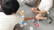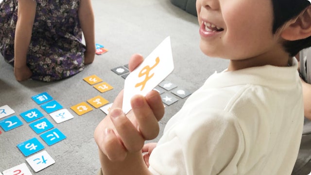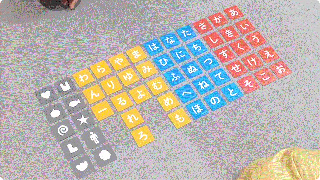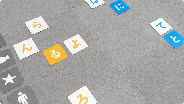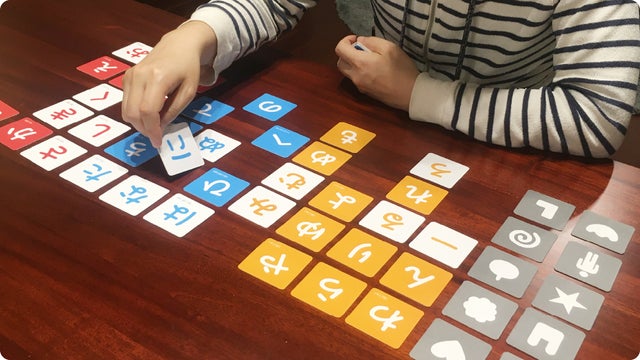 ゲーム開始!3文字以上のワードでしりとりをつなげます。1人目が「りんご」と言った場合、「り」と「ん」と「こ(ご)」の文字カードを裏返します。