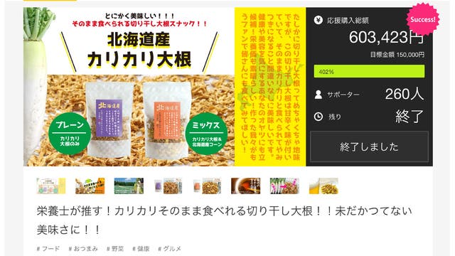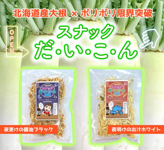 「Makuake(マクアケ)」は、実行者の想いを応援購入によって実現するアタラシイものやサービスのプラットフォームです。このページは、 フードカテゴリの 「【新装開店!?】スナックだいこん!北海道を食べ尽くせる切り干し大根のおやつ!」プロジェクト詳細ページです。