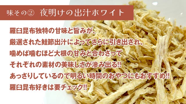ケイアイフーズのオリジナル「羅臼昆布鮭節出汁」に漬け込み乾燥させました。