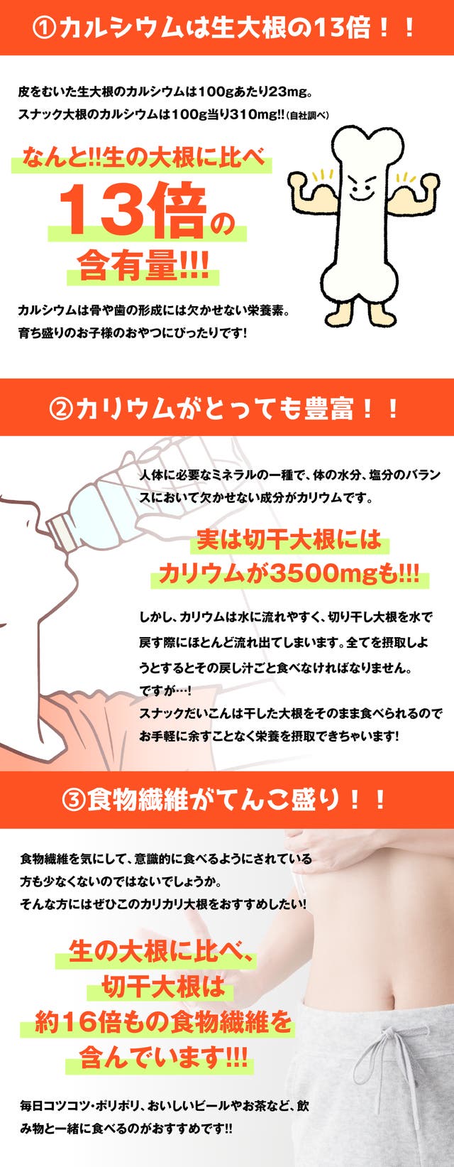 - 生の大根より栄養価が高い切干大根を使った、ポリポリ食感やみつき自然派スナックです!
